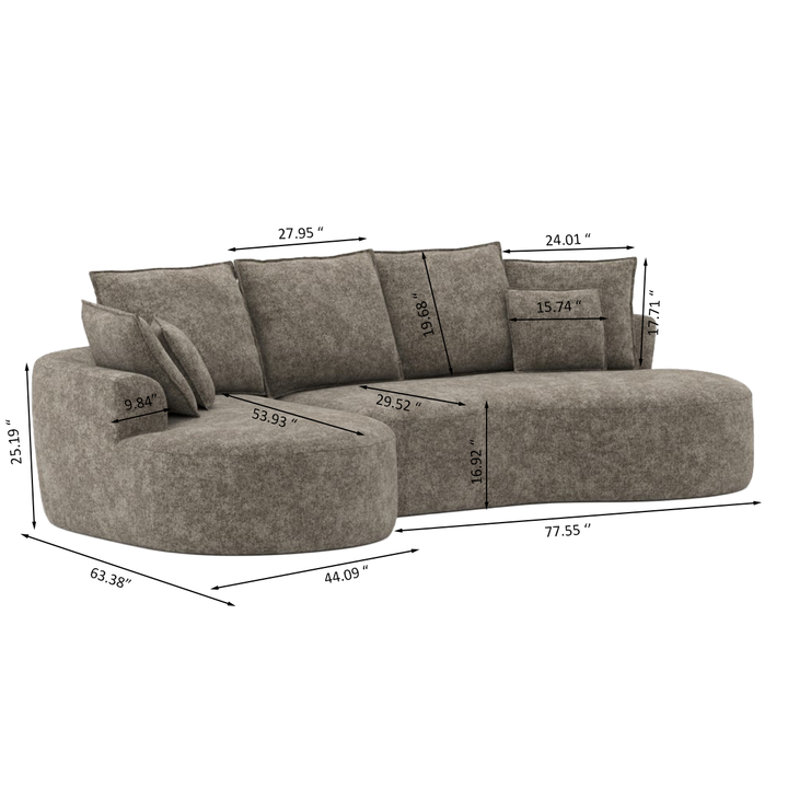 Expertly built with a solid hardwood frame and high-resilience foam cushioning, this sectional offers both durability and indulgent comfort. The charcoal fabric is richly textured and soft to the touch, resisting wear while maintaining its upscale appearance. Five matching pillows add extra coziness and a layered look.