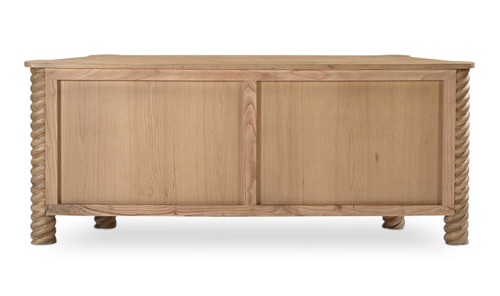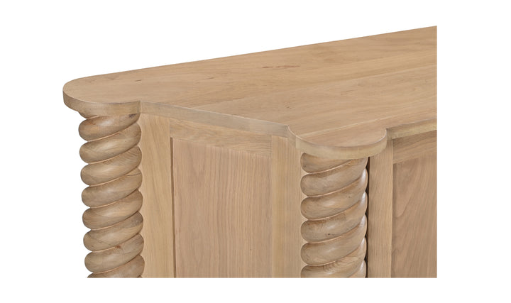Gillian Segal for Moe's The Treccia sideboard embodies a contemporary reinterpretation of classical aesthetics, distinguished by its intricate turned and braided details. The sideboard features exaggerated, elegantly detailed legs, presenting a bold modern twist while ensuring practicality. Its design is visually appealing while creating a welcoming, uncluttered space for everyday use.