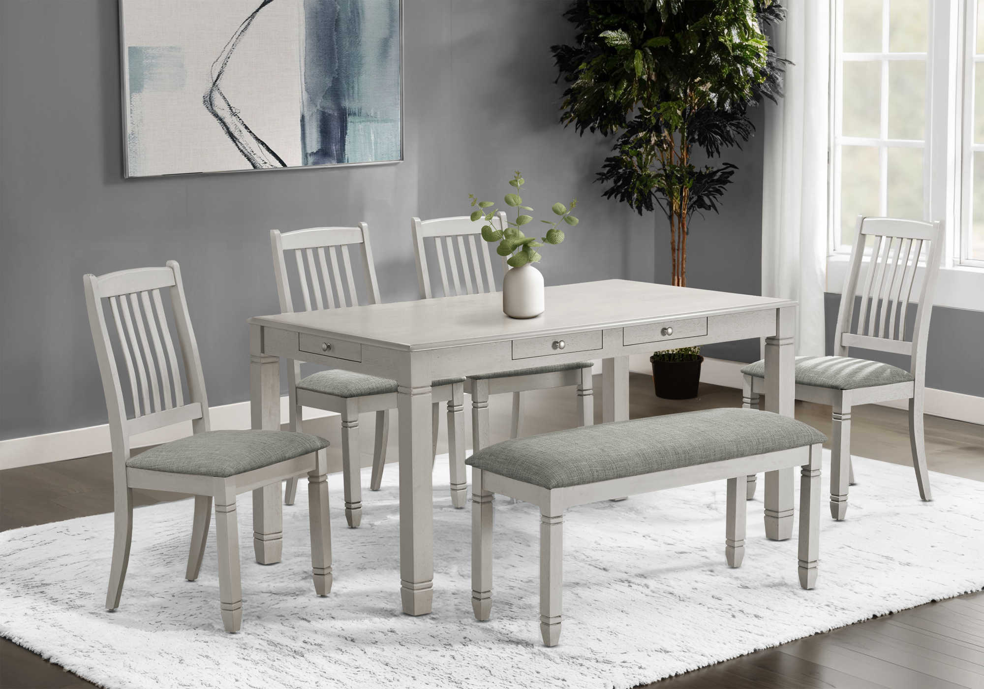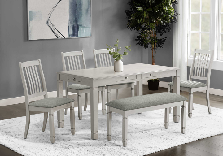 Add a touch of rustic charm and smart functionality to your dining space with the Willow Farmhouse Dining Bench. Crafted with solid wood in a soft antique white finish, this bench features elegant turned legs and a cushioned seat upholstered in textured gray fabric. At 40.25 inches long, it comfortably seats two and fits seamlessly under most dining tables.